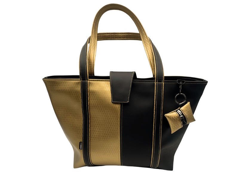 Shoppingliebhaber aufgepasst: Diese elegante, praktische Tragetasche ist der ultimative Shoppingbegleiter im Jubiläumsdesign aus Schwaz & Gold mit eleganter Prägung. Sie ist vollständig aus veganem Leder gefertigt. 100% Handmade im Vogtland – vegan – ökologisch. |
